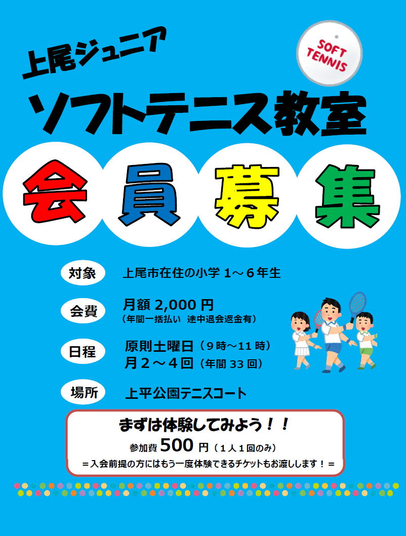 | 練習場所 上平公園 テニスコート 練習日時 土曜日or日曜日(月2〜4回)9:00〜11:00 or 13:00 |